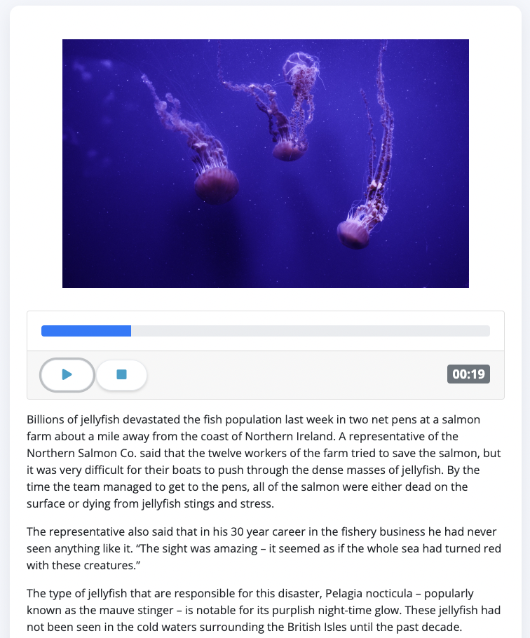 Texty jsou vždy krátkého rozsahu, cca 100–250 slov, aby s nimi nebylo časově náročné pracovat. Nahrávky obvykle trvají okolo minuty či minuty a půl. K dispozici jsou články nejrůznějšího druhu, od zpráv, rozhovorů, faktických článků, až po povídky či dokonce básně.