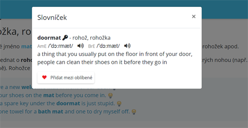 Ihned po označení slova se otevře okénko slovníku a zvolený výraz se v něm vyhledá. Kromě překladu si můžete také přečíst jeho definici nebo přehrát výslovnost. Pokud se rozhodnete se slovíčkem ještě někdy pracovat, můžete ho označit jako oblíbené.