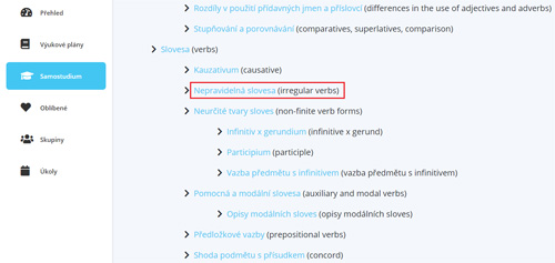 V rejstříku gramatických jevů (v sekci Samostudium) naleznete položku „nepravidelná slovesa“.
